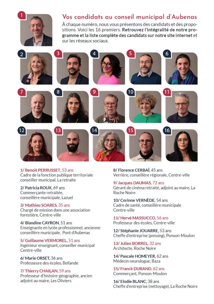 Engagés depuis plus d’un an pour bâtir un projet commun, nous faisons le choix de mettre l’expérience de nos élus, de nos partis et mouvements politiques au service d’une dynamique citoyenne. Socialistes, écologistes, communistes, mais surtout femmes et hommes d’horizons différents, engagés dans la ville nous portons l’alternative pour réveiller Aubenas.